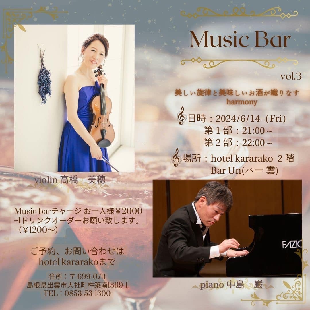 出雲市大社町のHotel kararako 2F Bar Un(バー雲)にて開催される Music Bar のご案内です。