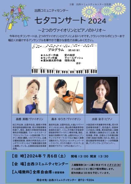演奏会 【終了しました】2024年7月6日(土)出西コミュニティセンター 七タコンサート 2024 〜2つのヴァイオリンとピアノのトリオ~